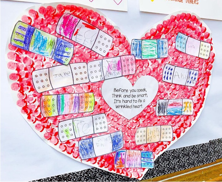 We also use this book to discuss using kind words and what happens to someone’s heart when unkind words are said. Everyone makes a promise to always think before they speak and colors a bandaid to “fix” the heart.